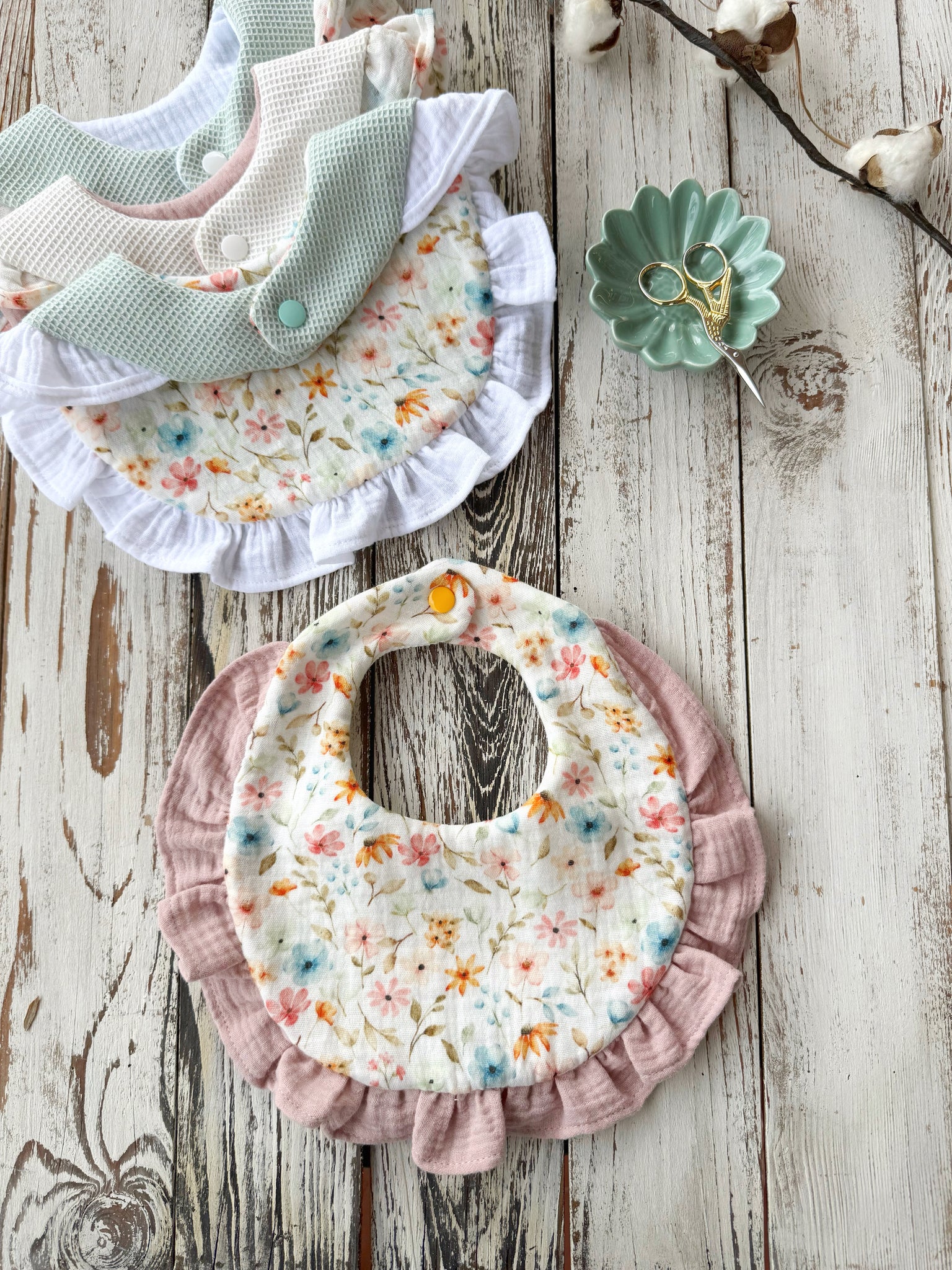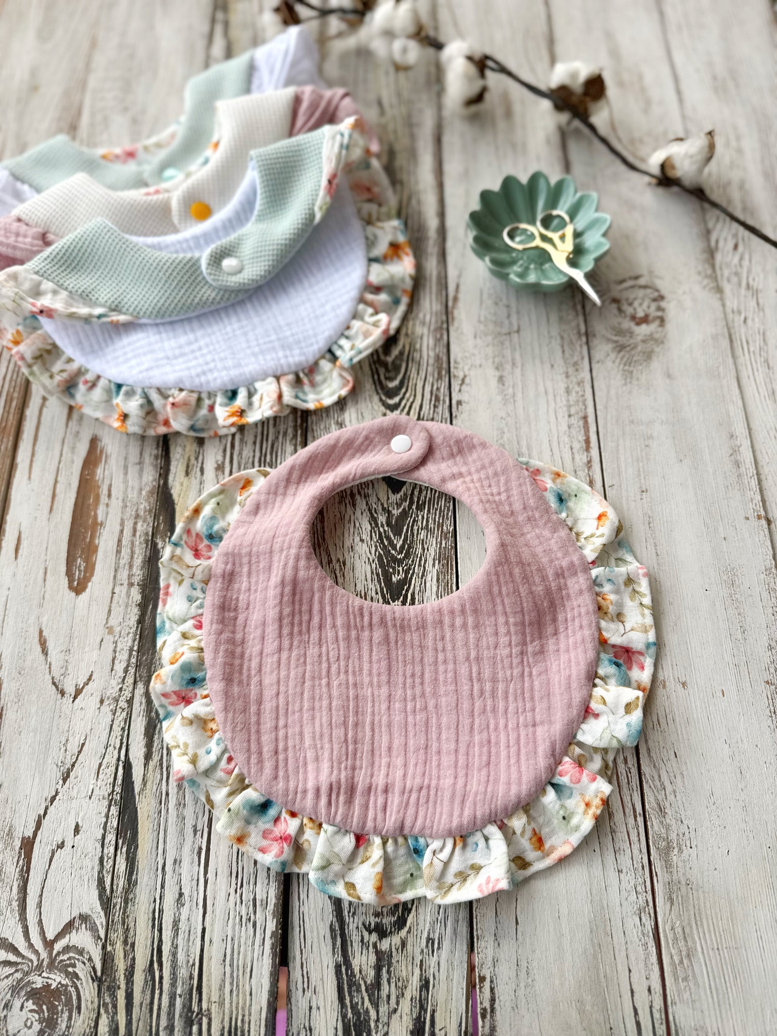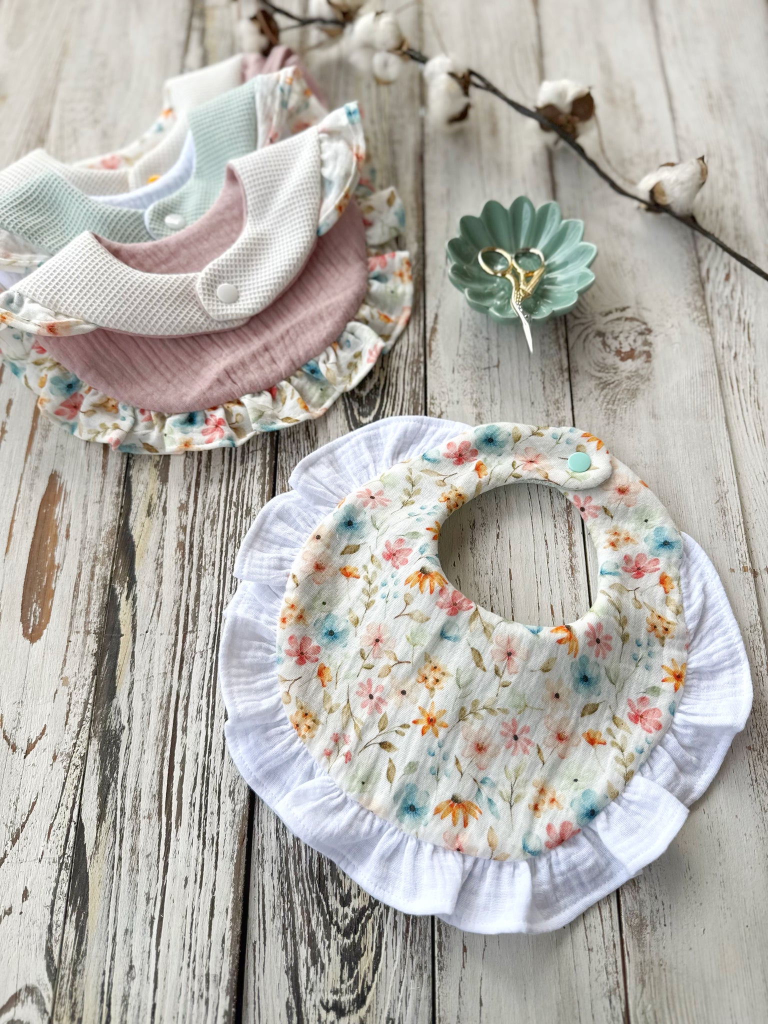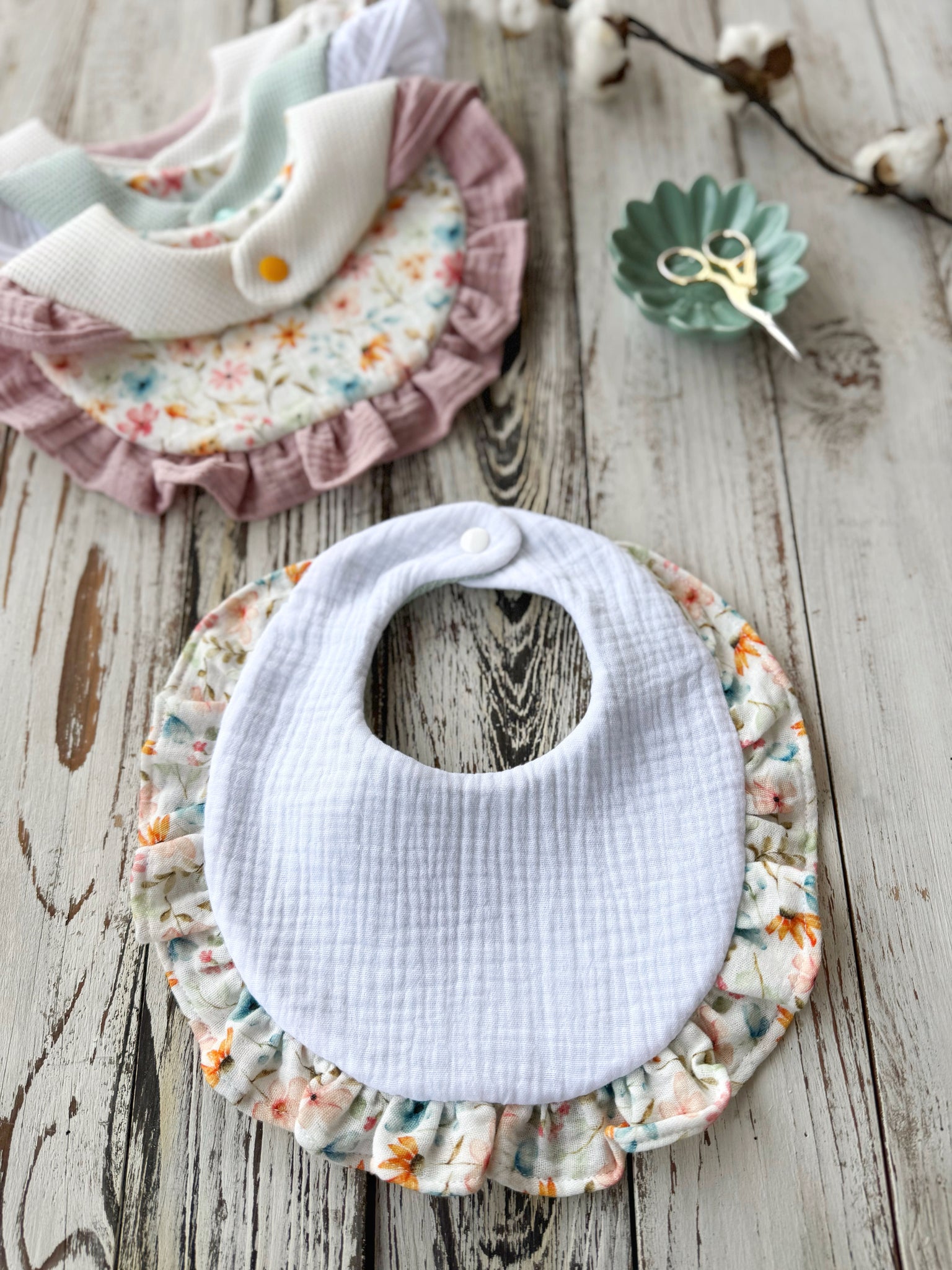 I bavaglini per neonati con volant possono eventualmente diventare parte di un delizioso set regalo per neonati personalizzato.