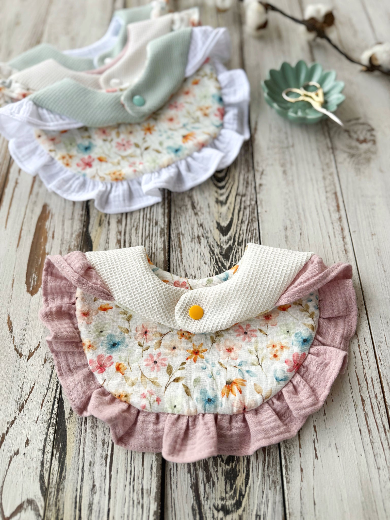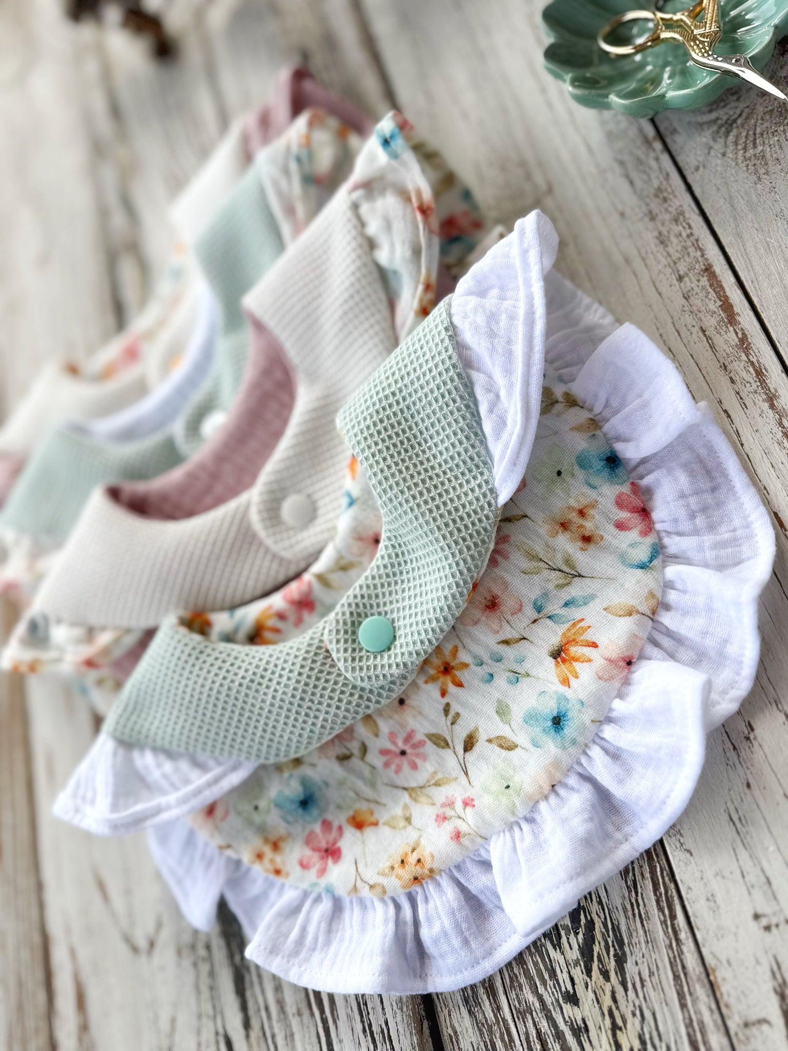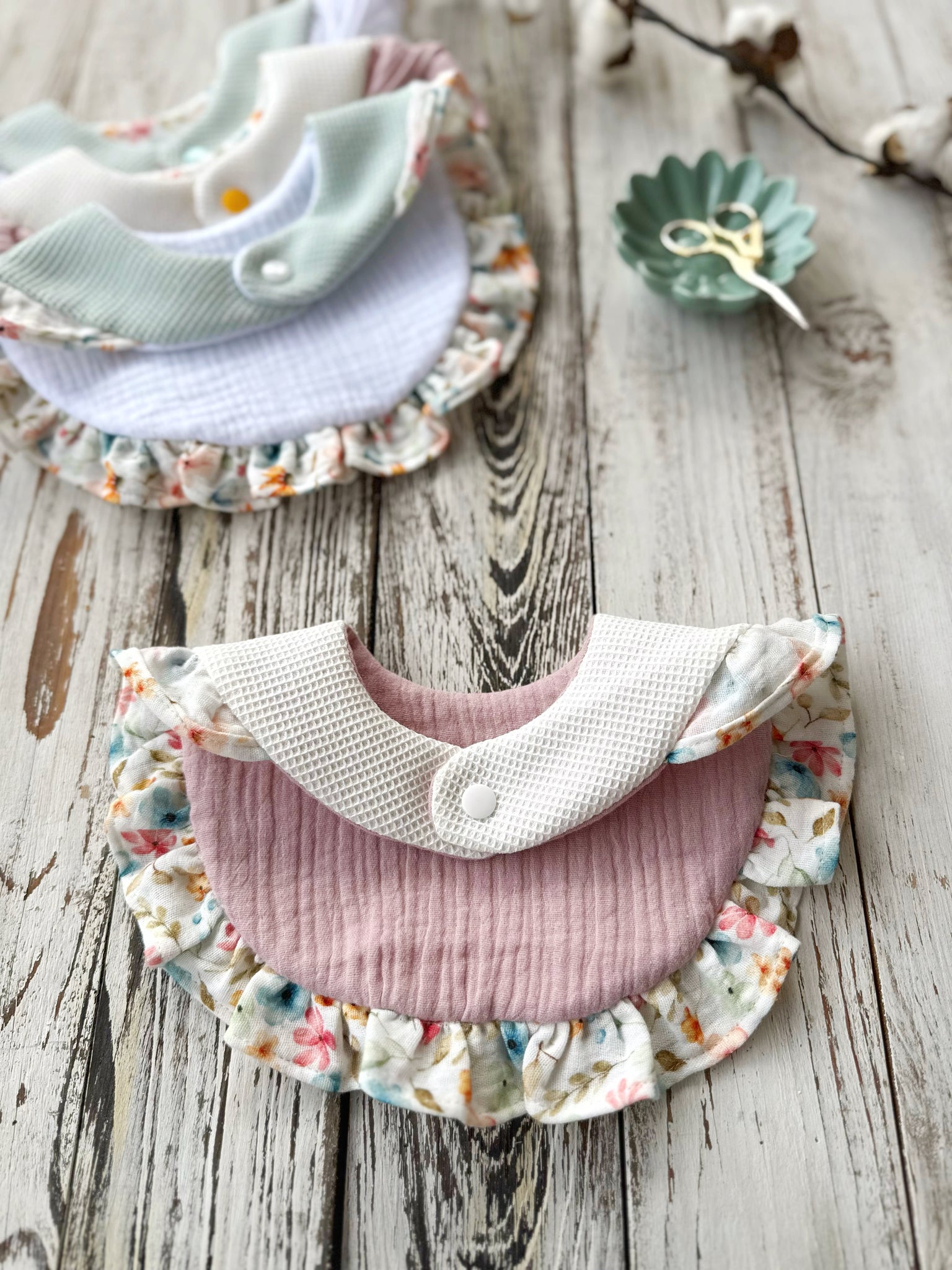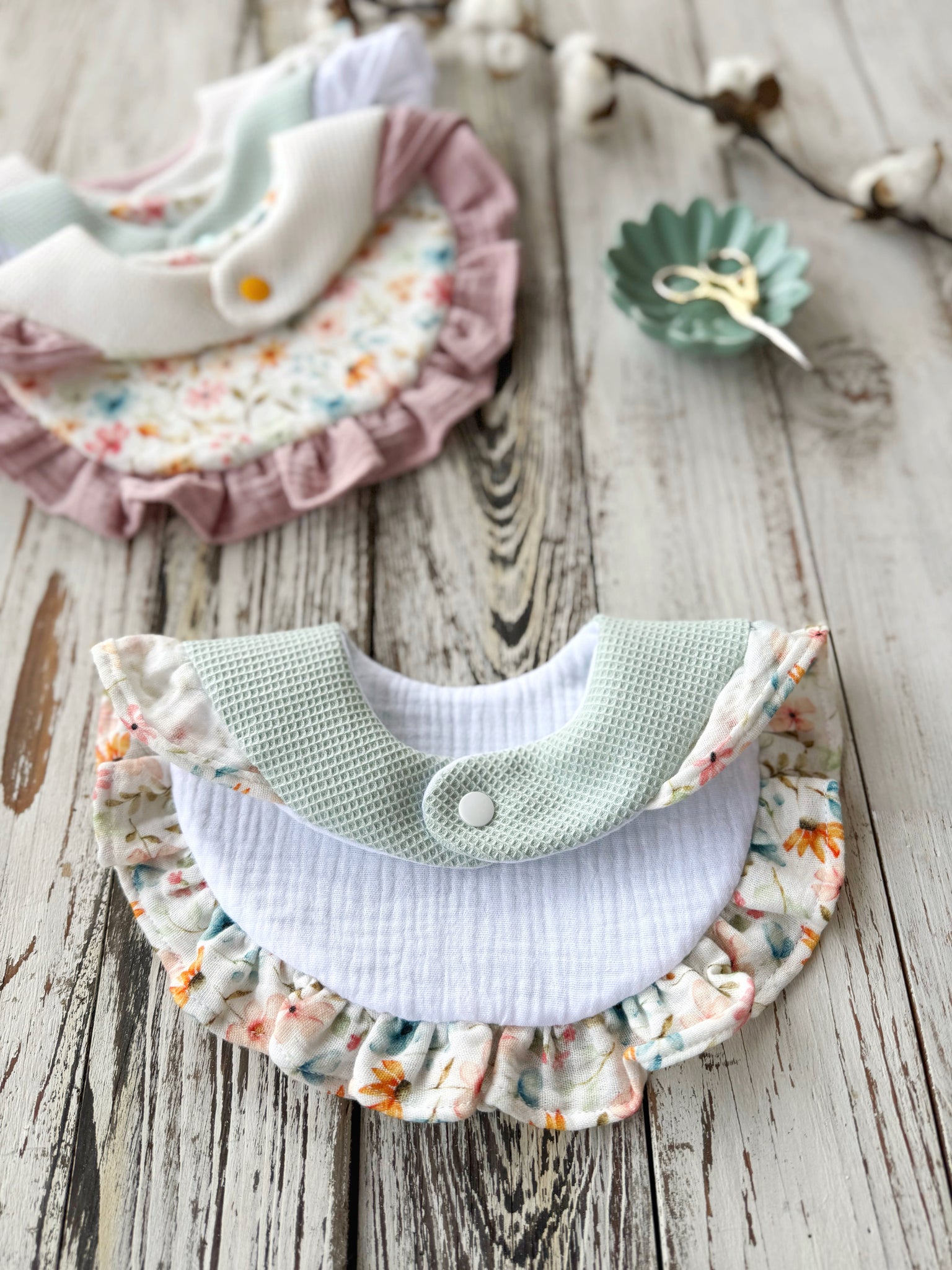 I bavaglini per neonati con volant possono eventualmente diventare parte di un delizioso set regalo per neonati personalizzato.