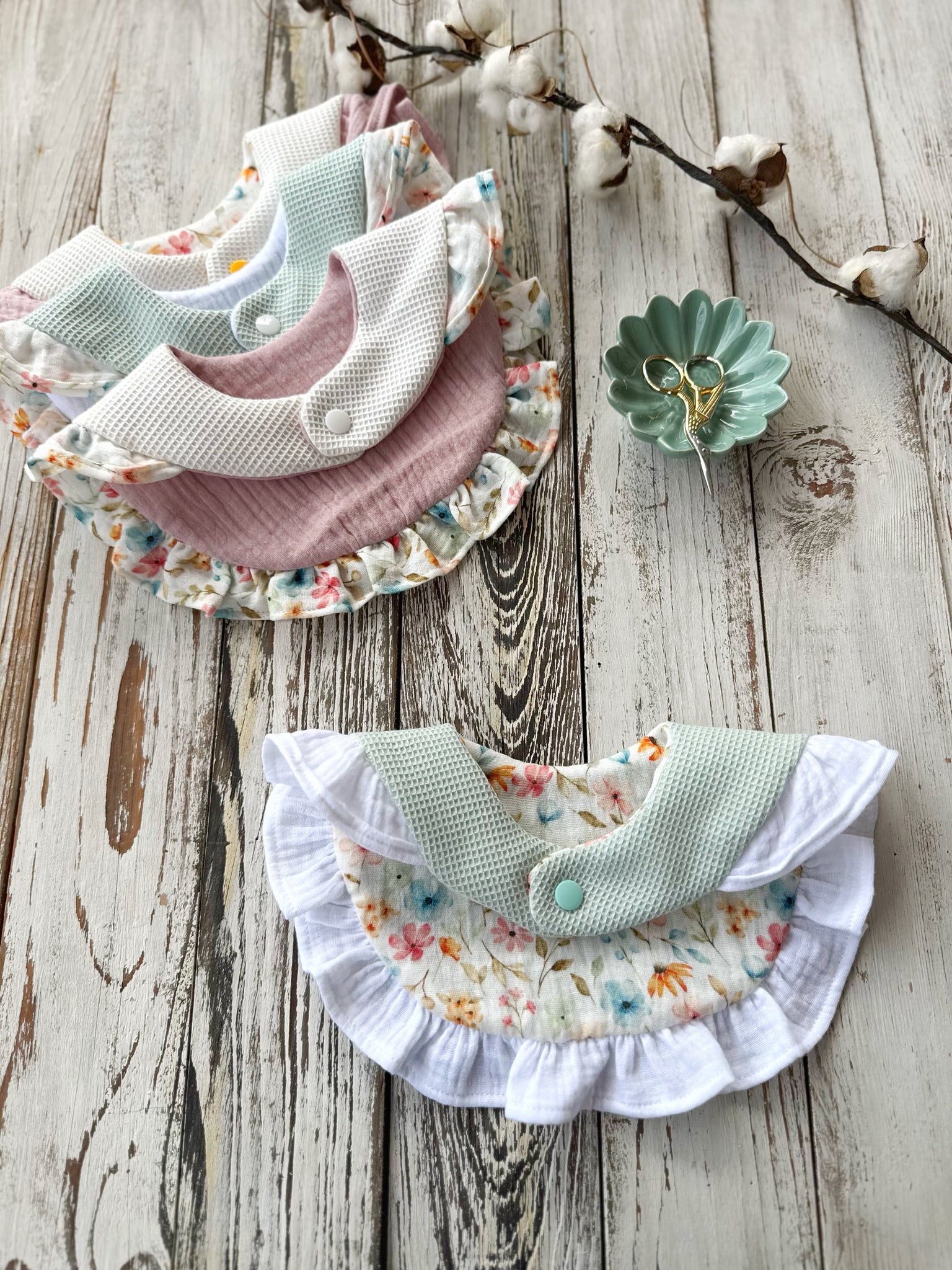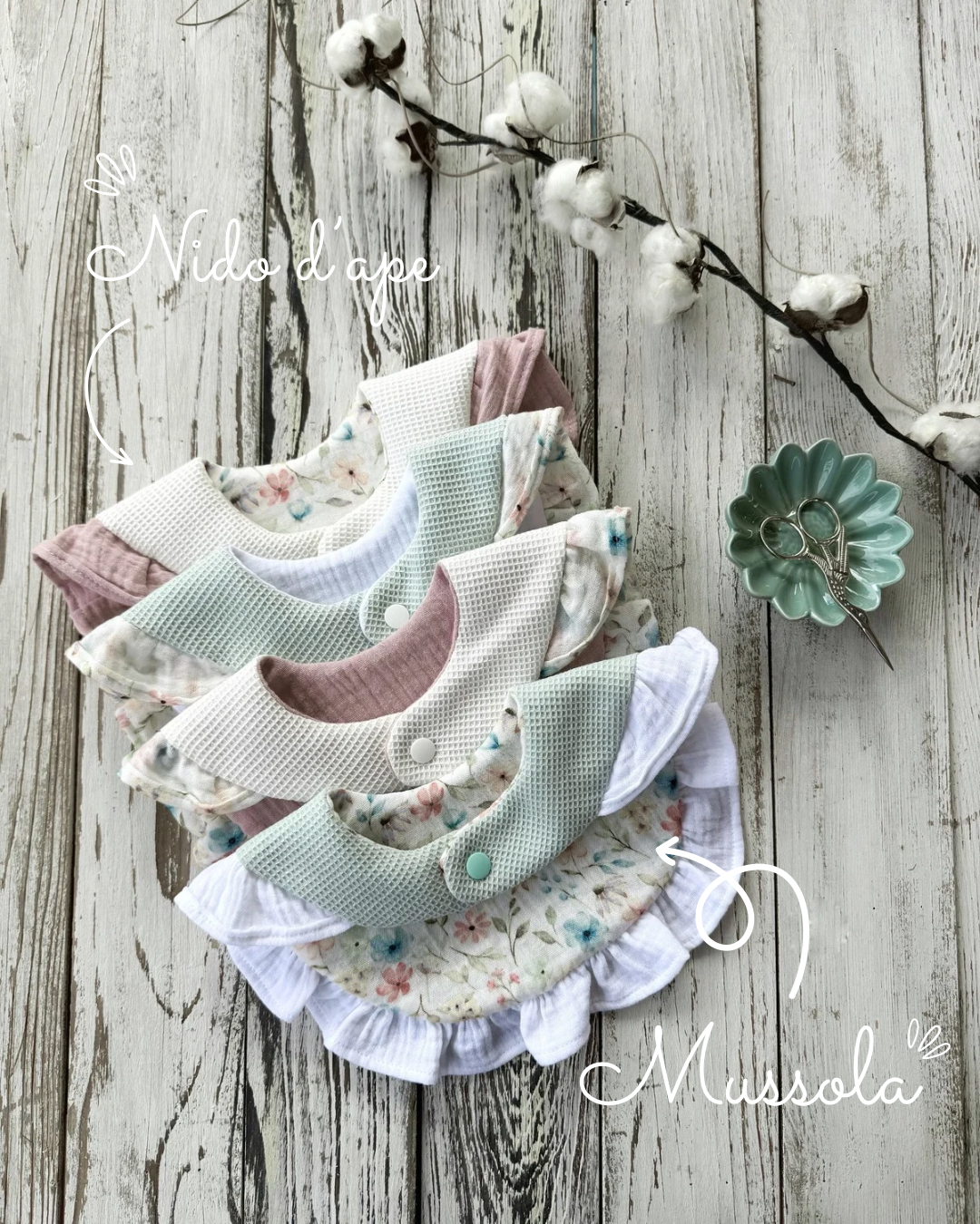 I bavaglini fatti a mano sono realizzati in puro cotone nido d'ape e mussola traspirante.